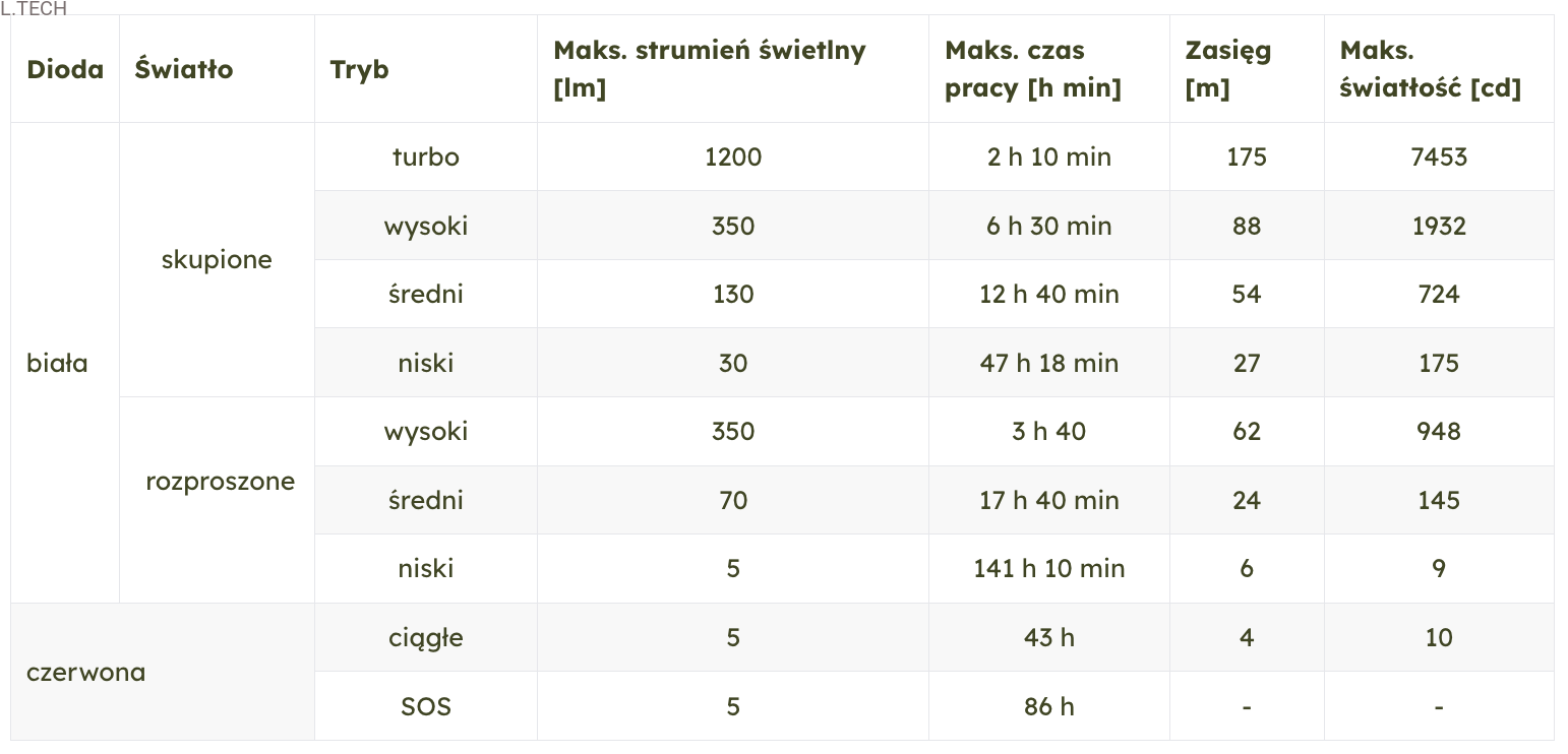 - Maksymalna moc 1200 lumenów i zasięg wiązki do 175 m.
