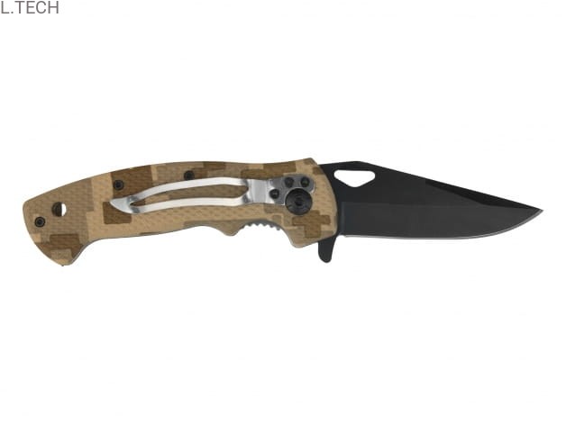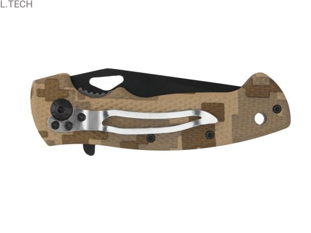 Wysokiej jakości nóż hiszpańskiej marki Joker znanej na całym świecie ze swoich doskonałych wyrobów. Jest to uniwersalny, składany nóż w całości wykonany z mocnej stali nierdzewnej. Rękojeść wykonana jest z wytrzymałego metalu o ciekawym wzornictwie z gumowanymi okładzinami w kolorze kumuflażu typu desert. Nóż wyposażony jest w fliper który umozliwa szybkie i bezproblemowe otwarcie noża. Pewna i skuteczna blokada noża typu Liner Lock zapobiega niekontrolowanemu złożeniu się noża. Nóż posiada klips umożliwiający przypęcie do pasa czy też schowania do kieszeni.